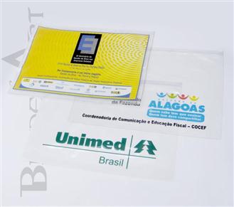 Pastas PVC: Modelo Envelope, confeccionada em cristal 0,20mm, Zip Lock, acabamento em solda eletrônica e medindo 26x36cm. Personalização em Silk Screen com 01 cor já inclusa.
