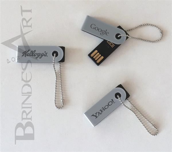 Mini pendrive tipo chaveiro, com abertura lateral, estilo canivete e disponível em diversas cores. Capacidade de armazenamento de 4Gb, USB 2.0, memória COB resistente a choque e a água. Inclusa personalização por gravação em baixo relevo a laser.